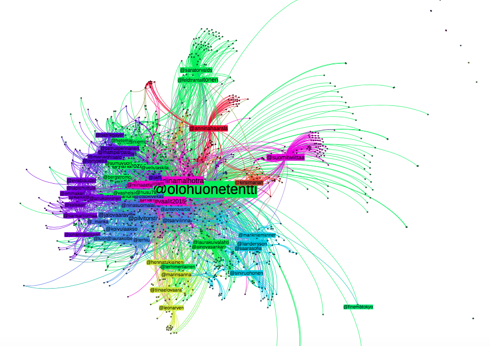 Twitterissä olohuonetentti-keskusteluun osallistui kirjava joukko yksittäisiä käyttäjiä – niin ehdokkaita, toimittajia kuin kansalaisiakin. Kun kuvan verkostoa verrataan #vaalit2015-twiiteistä tehtyyn verkostoanalyysiin, nähdään selvästi kuinka olohuonetentin ympärillä puolueet eivät erotu omina siiloinaan, vaan Twitter-pöhinää käytiin laajasti ylitse puoluerajojen. Voidaankin sanoa, että olohuonetentti onnistui sekoittamaan perinteisiä Twitter-kuplia.