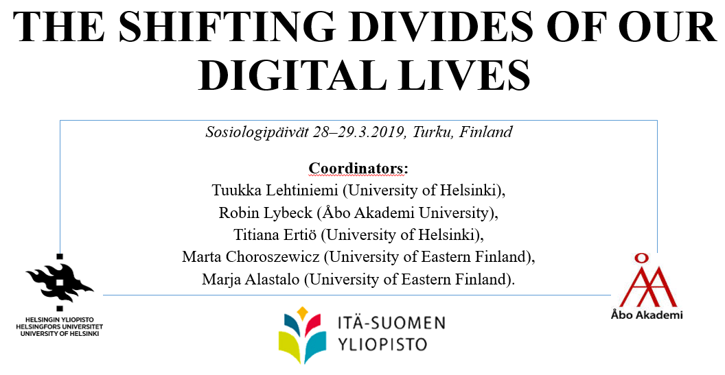 Partly inspired by the above-mentioned research, we recently organized a working group at the Annual Finnish Sociology Conference, The Shifting Divides of Our Digital Lives, to discuss old and new forms of inequalities, the reactions they provoke, and their societal consequences. To guide our presenters, we posed some additional questions: What hinders or facilitates equal participation in the digital society? How are social institutions adapting to digital change? What forms of civic engagement and activism arise given digital society’s asymmetries?