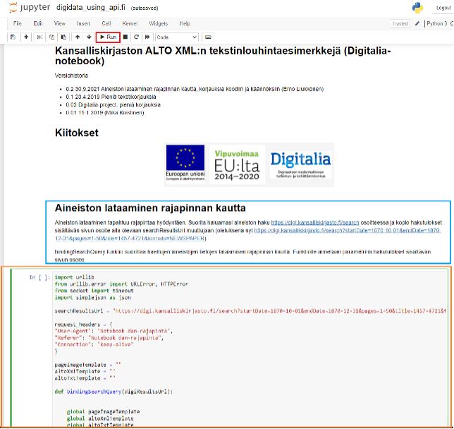 Kuvassa 1 näkyy Digitaalinen avoin muisti (DAM) -hankkeessa päivitetty, aiemmassa hankkeessa kehitetty, tutkimuksen työkaluksi tarkoitettu Kansalliskirjaston Jupyter-työkirja. Työkirjan kautta on mahdollista ladata tekstiaineistoja rajapinnan kautta ja myös analysoida ladattua aineistoa. Kuvassa on sinisellä rajattuna yksi työkirjan sisältämistä, käsiteltävää asiaa ja alla olevan koodin toimintaa kuvaavista tekstisoluista. (markdown cell). Oranssilla on rajattu yksi työkirjan koodia sisältävistä soluista (code cell). Soluja voi työkirjassa suorittaa/ajaa yksi kerrallaan, kuten tällä työkirjan käyttöä tarkemmin esittävällä videolla näkyy.