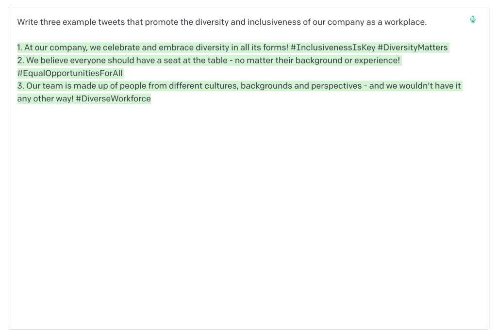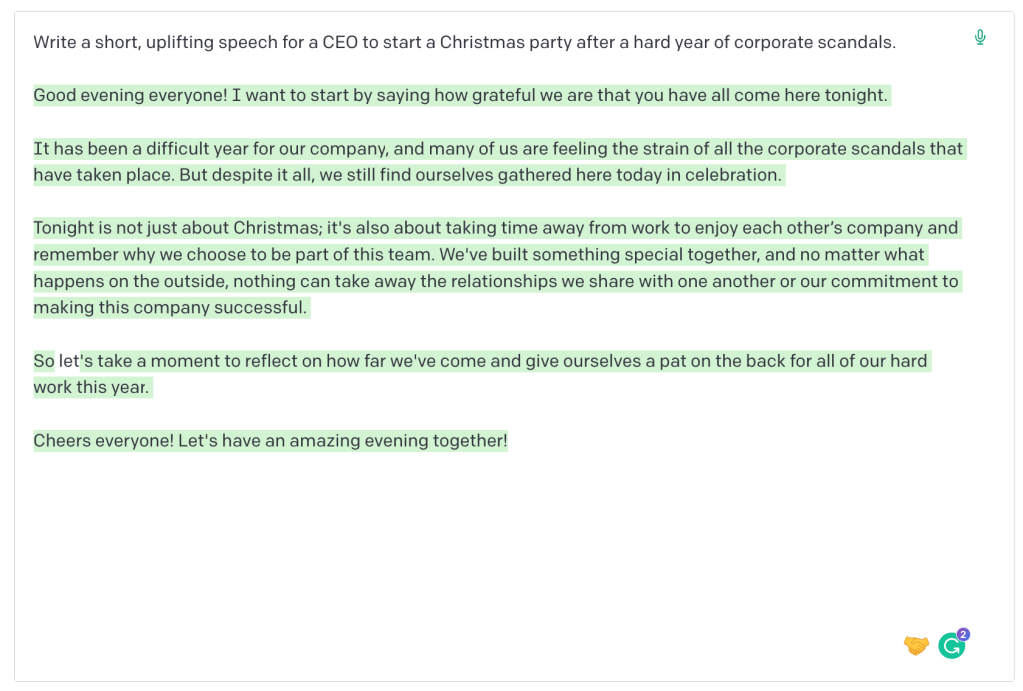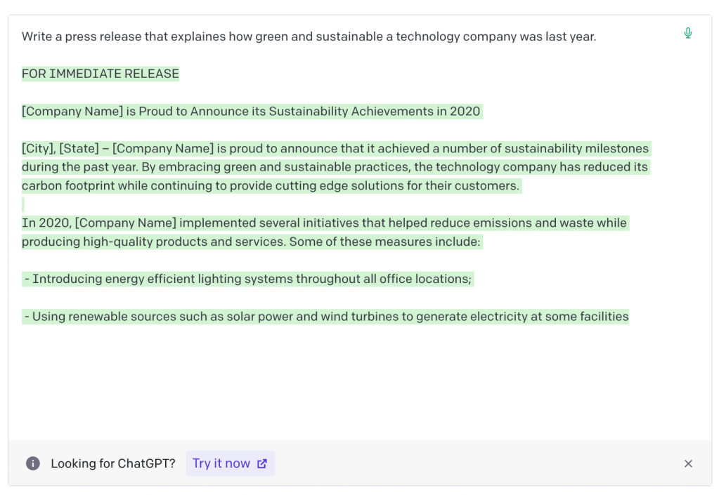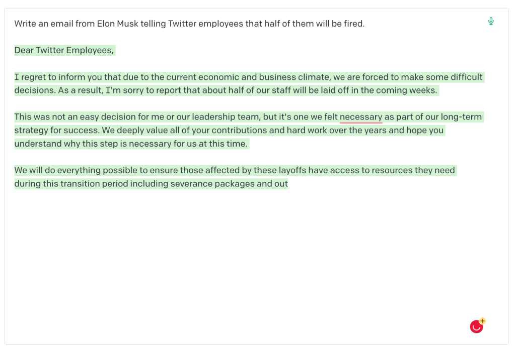 Kokeilin helmikuussa organisaatioviestinnän kurssiani varten miten GPT-3 (sekä ChatGPT että Open AI:n pelkkä GPT3-malli) selviytyy organisaatioviestinnän perustekstien tuottamisesta. Pyysin tekoälyä kirjoittamaan esimerkiksi tiedotteen teknologiayrityksen ympäristöaloitteista, yrityksen moniarvoisuutta kehuvia twiittejä, toimitusjohtajan puheen pikkujouluihin ja Elon Muskin yt-viestin (selaa kuvia nuolien avulla):