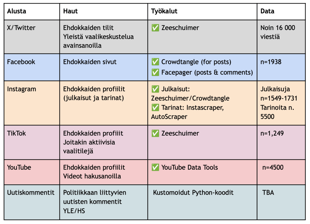 - X:n ja TikTokin sisältöjä on kerätty Zeeschuimer-nimisellä selainlisäosalla, joka kerää aineistoa samalla kun käyttäjä selaa verkkosisältöjä. Keräys on keskittynyt myös yleiseen vaalikeskusteluun erityisesti X:ssä.Zeeschuimer toimii hienosti esimerkiksi etnografisen otteen rinnalla, mutta samalla aineiston keruu on väistämättä riippuvainen selaimen käyttäjän tekemisestä ja kenties myös selailuhistoriasta — palvelut saattavat näyttää eri käyttäjille erilaista sisältöä varsinkin uutisvirtanäkymissä. Pyrimme välttämään algoritmien vaikutusta tekemällä keräystä erillisellä tutkijatilillä.